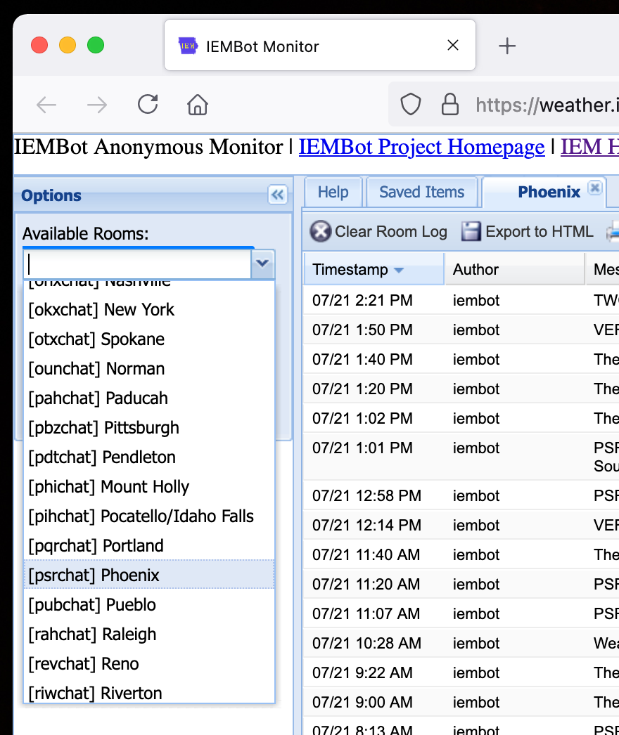 If you’re in Phoenix, you’ll want to select “[psrchat] Phoenix” from the Available Rooms picker and you’ll get a running list of the weather products